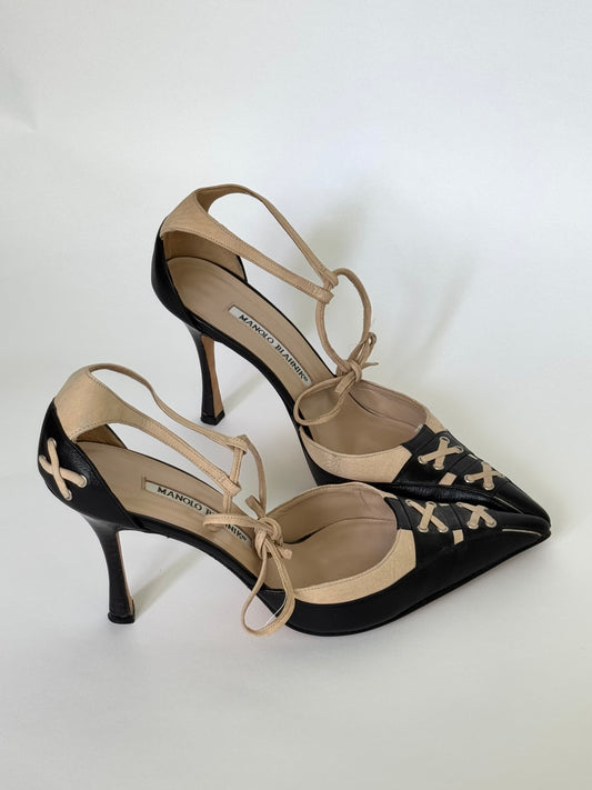 Manolo Blahnik Black and Beige Cross Stitched D'Orsay Pumps (IT38 / US8-8.5)