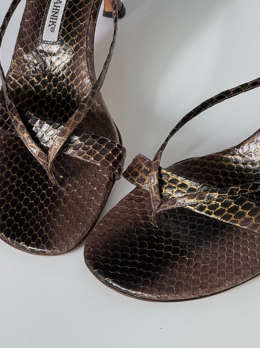 Manolo Blahnik Snakeskin Metallic Brown T-Strap Sandals (IT38 / US7-7.5)