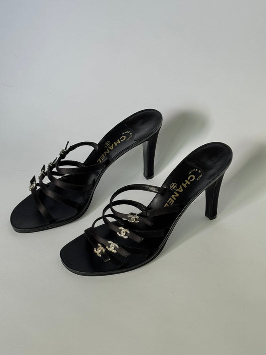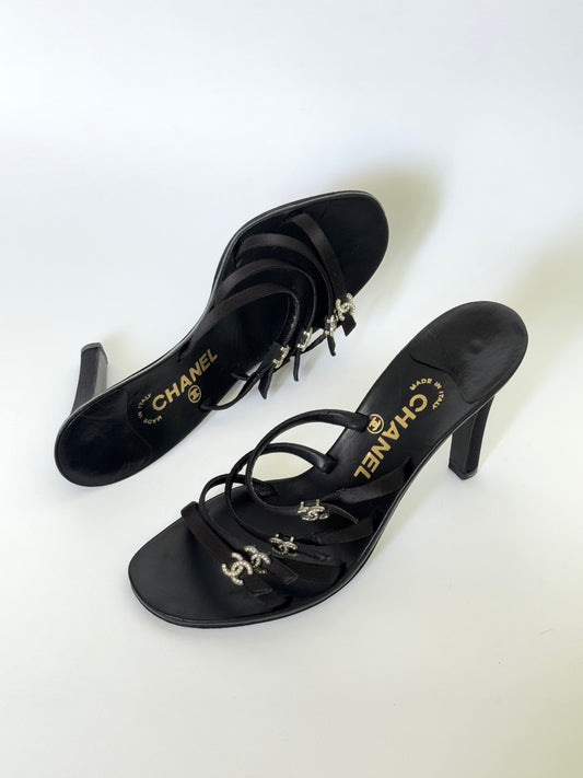 CHANEL Black Satin Rhinestone CC Slides (IT38 / US7-7.5)