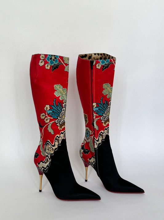 SS2003 Roberto Cavalli Chinoiserie Red Satin Boots (IT37 / US7-7.5)