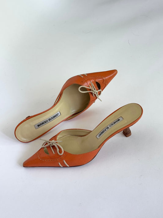Manolo Blahnik Leather Orange Broguing Bow Mules (IT36.5 / US5.5-6)