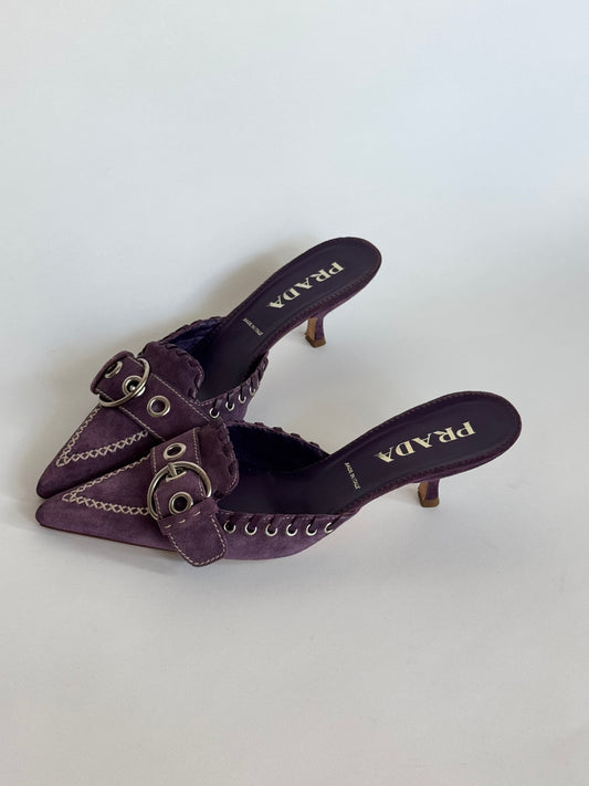 Prada Purple Suede Buckle Mules (IT39 / US8.5-9)
