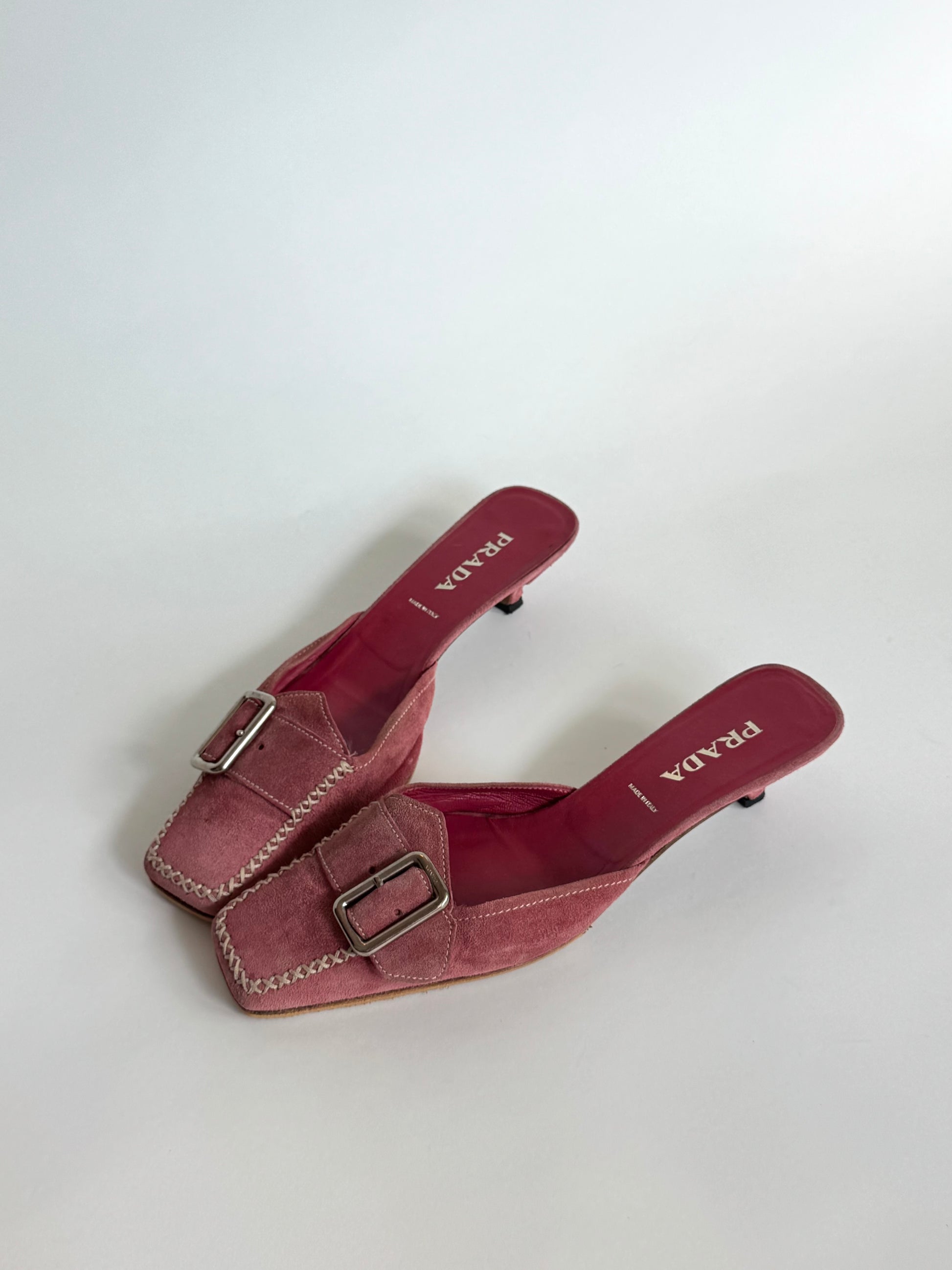 Prada Pink Suede Buckle Mules (IT36.5 / US6-6.5)